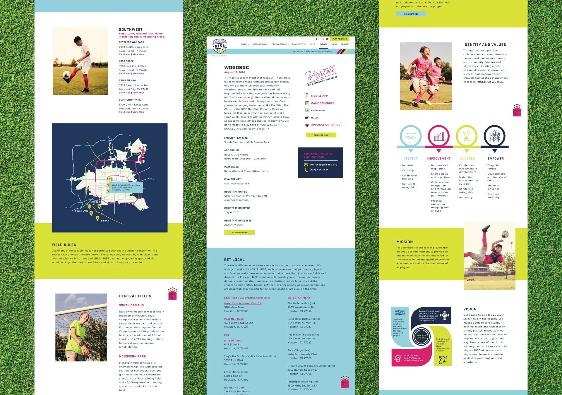RISE Soccer Club is Houston’s largest youth soccer organization, serving players of all levels, from recreational beginners to college-bound athletes. As the club rapidly expanded through mergers, it needed a modern brand presence and a functional, user-friendly website that matched its scale and professionalism. I redesigned the website to streamline content, improve navigation, and create a dynamic, visually engaging experience. Key information that was previously buried in downloadable PDFs is now presented through editable charts and intuitive layouts, making it easier for parents to access what they need.